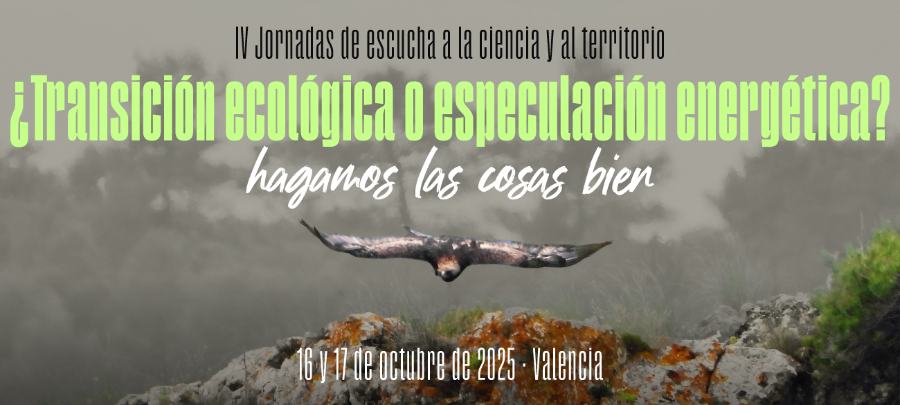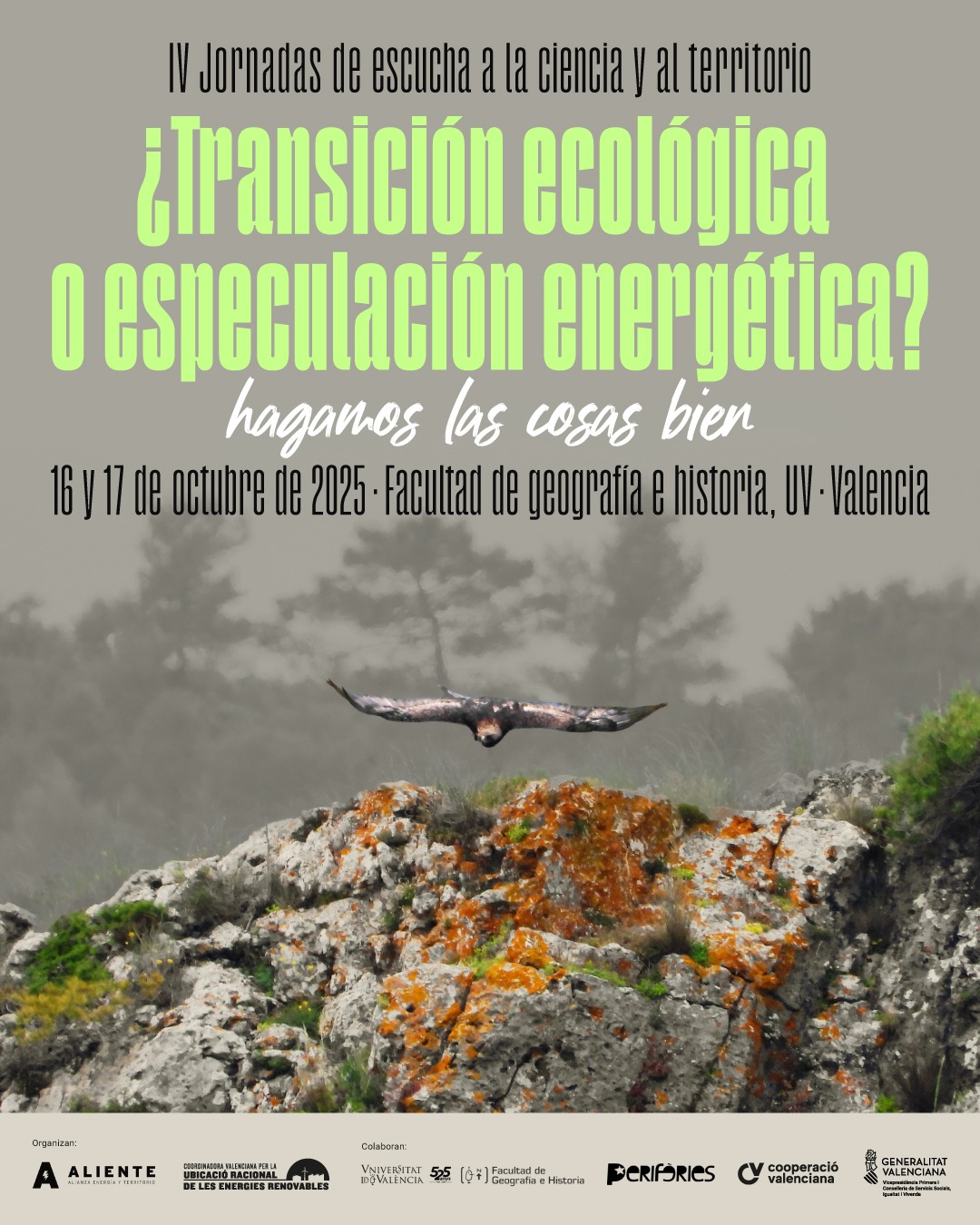 La Alianza Energía y Territorio -ALIENTE- junto a la Coordinadora Valenciana per la Ubicació Racional de les Energies Renovables y la Facultad de Geografía e Historia de la Universitat de València, organizan estas IV Jornadas “de Escucha a la Ciencia y al Territorio” con el objetivo de realizar un análisis en profundidad del actual proceso de transición energética y del despliegue de energías renovables en nuestro país. Con el propósito de conseguir una transición energética justa y democrática, es importante identificar los problemas que dicho despliegue, masivo y desordenado, está causando en el mundo rural, en el paisaje y en la biodiversidad, así como proponer soluciones a los mismos. Así, se pretende hacer oír la voz de la ciencia y de los territorios: de científicos, técnicos, asociaciones, plataformas, y de ciudadanos de la España rural y la mal llamada “España vaciada”.